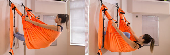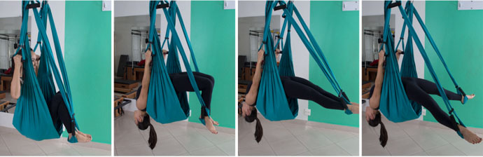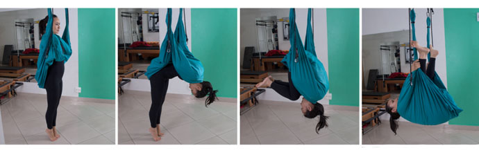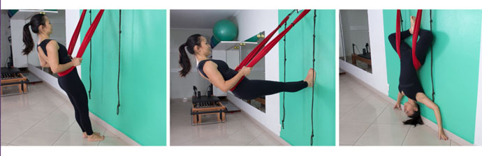 Apoiar a lombar no tecido, pisar na parede, unir os pés, sentar na parede, em seguida levar os joelhos para fora do balanço levando ao mesmo tempo a cabeça para baixo.