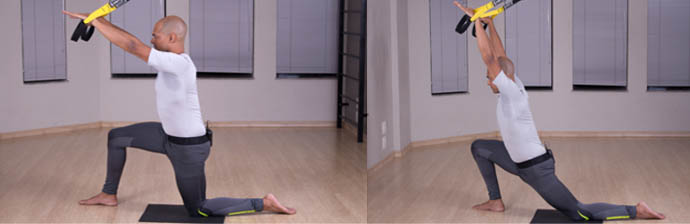 Segurando na fita de suspensão realize o movimento de afundo empurrando a bola para trás.
