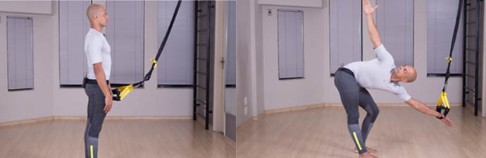 Depois rotacione o tronco levando a mão para cima. A mão que está segurando a fita de suspensão vai para frente durante o movimento.