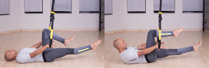 Posição inicial com o tronco elevado e pernas flexionadas, segurando com as duas mãos a fita de suspensão.