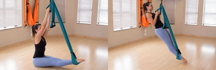 Travar os pés nas laterais do tecido e levar o tronco para frente.