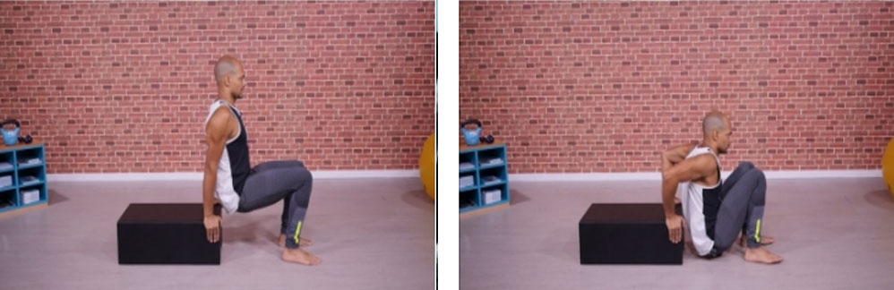escapular, associados ao fortalecimento do tríceps. Apoie as mãos na caixa, de costas para ela, e os pés no solo;