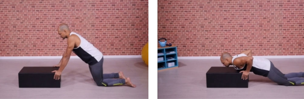 joelhos, estendendo-os e mantendo apoio apenas dos pés no solo e das mãos na caixa. Para dificultar ainda mais,