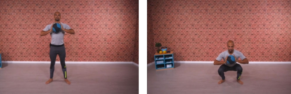 Este exercício tem por objetivo fortalecer MMII e MMSS, associado à mobilização de quadril e estabilização de cintura escapular, além de equilíbrio, coordenação e propriocepção. Assuma posição ortostática, pés afastados e em rotação externa, joelhos estendidos, quadris neutros, ombros em abdução de aproximadamente 135º, cotovelos estendidos, mão direita segurando a medicine ball. Realize um agachamento, flexione os joelhos e os quadris, desça o tronco discretamente para frente. Retorne à posição inicial e não se esqueça de realizar o exercício com a medicine ball do outro lado! Você pode variar segurando o acessório com as duas mãos ao mesmo tempo.